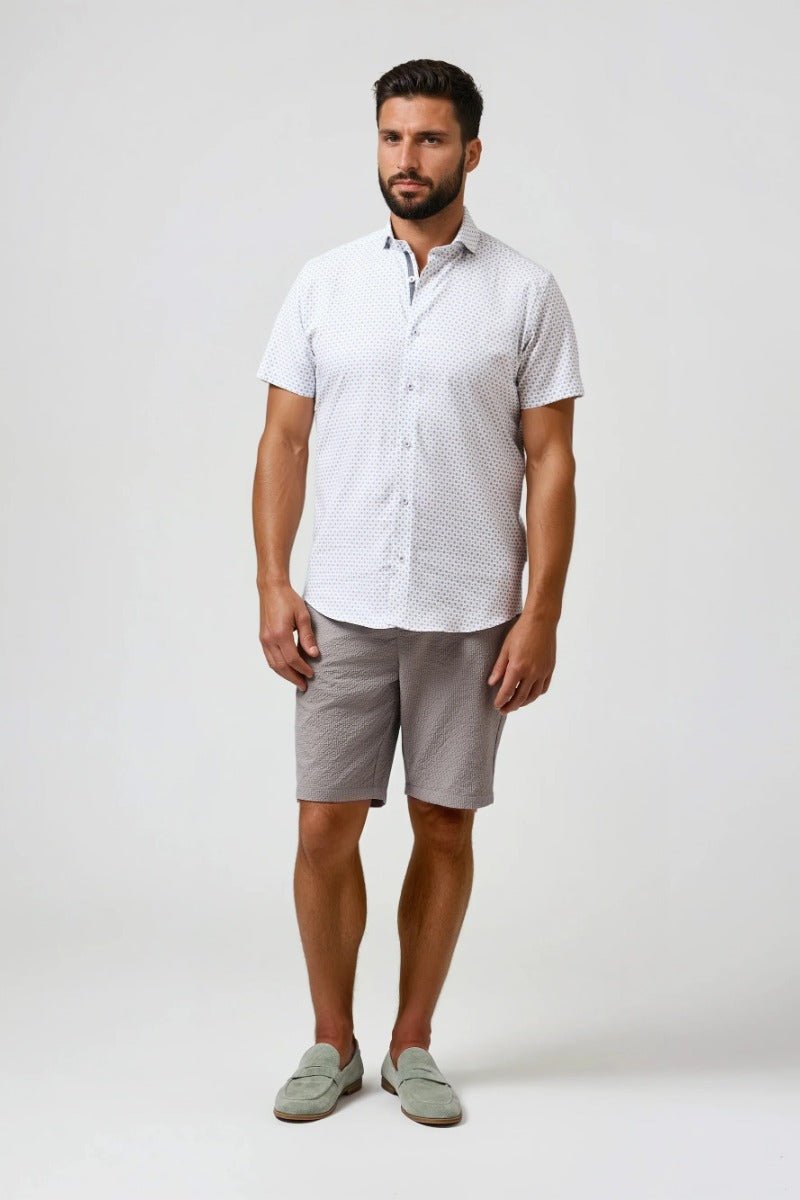 The Nova - Green Circular Print Shirt features a premium blend of cotton, TENCEL™ and elastane that delivers breathable comfort with a soft, peachy hand-feel. This versatile dress shirt combines moisture-wicking properties with 2-way stretch for all-day wearability.