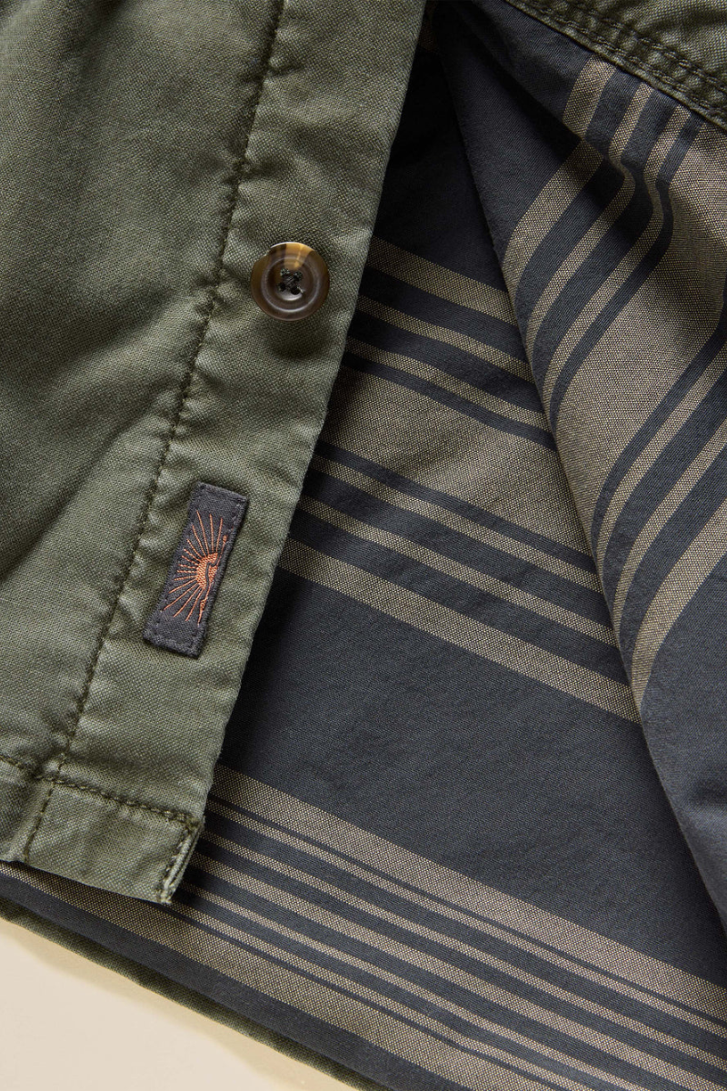 - Detail: Button front closure. Shirt style collar. Patch pockets at chest with button closure. Lower pockets hidden at side seams. Locker loop at interior back neck seam. Fully lined.