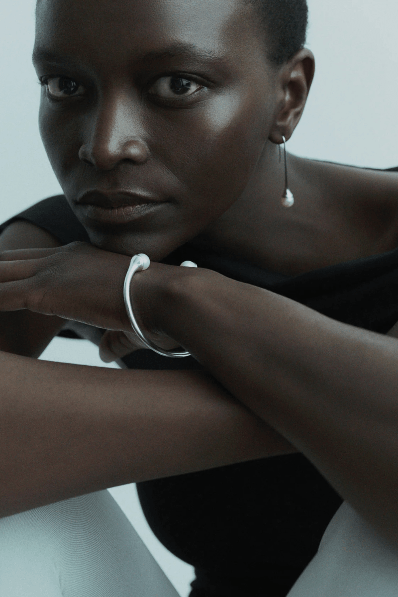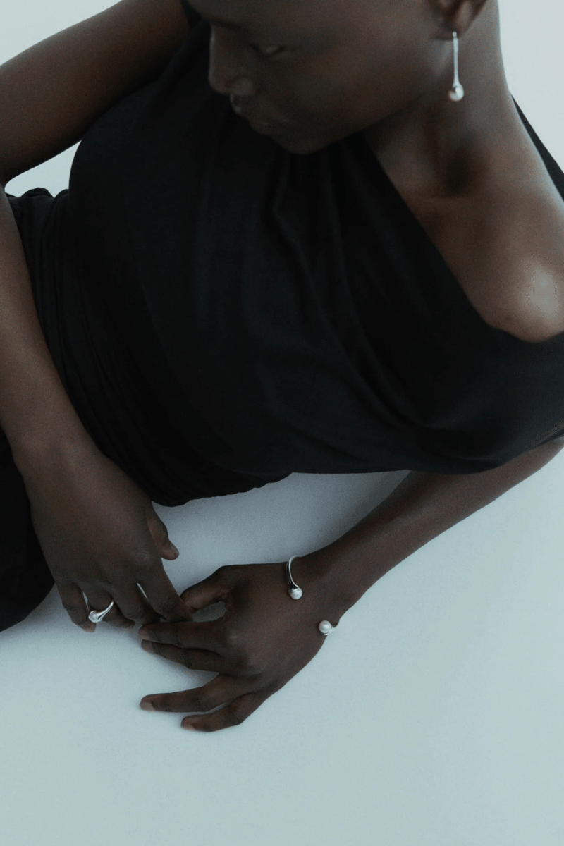 Crafted in 925 sterling silver, the Lumora Bangle curves around the wrist and ends with two freshwater pearls resting delicately on top. A clean, sculptural piece that brings together strength and softness in one refined design.