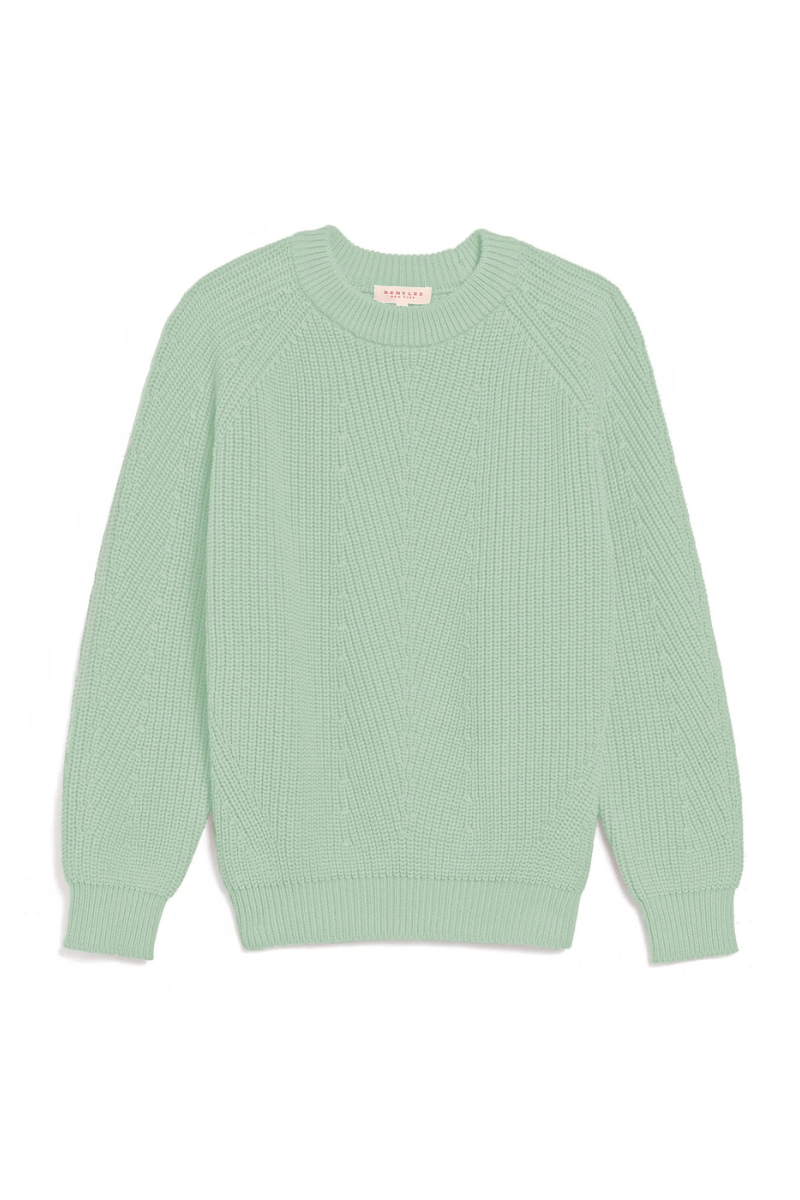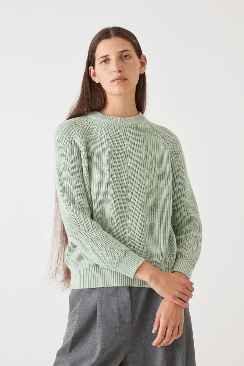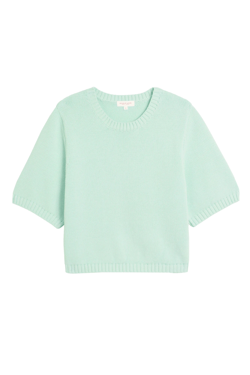 Long-sleeve crewneck sweater with slightly puffed sleeves. Textured stitching...