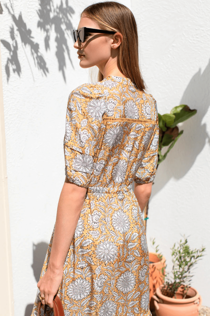 The Mallories Dress in Amber Glow showcases an eye-catching...