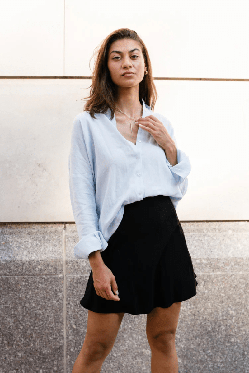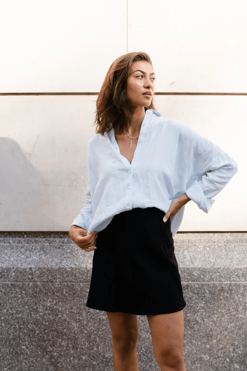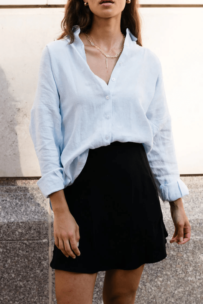 The Scoop: A wardrobe staple beyond all others, the Closet Hero. A classic silhouette with single button cuffs and a front button closure. Breathable and effortless. It has an overall relaxed fit which makes it perfect for those warmer days.
