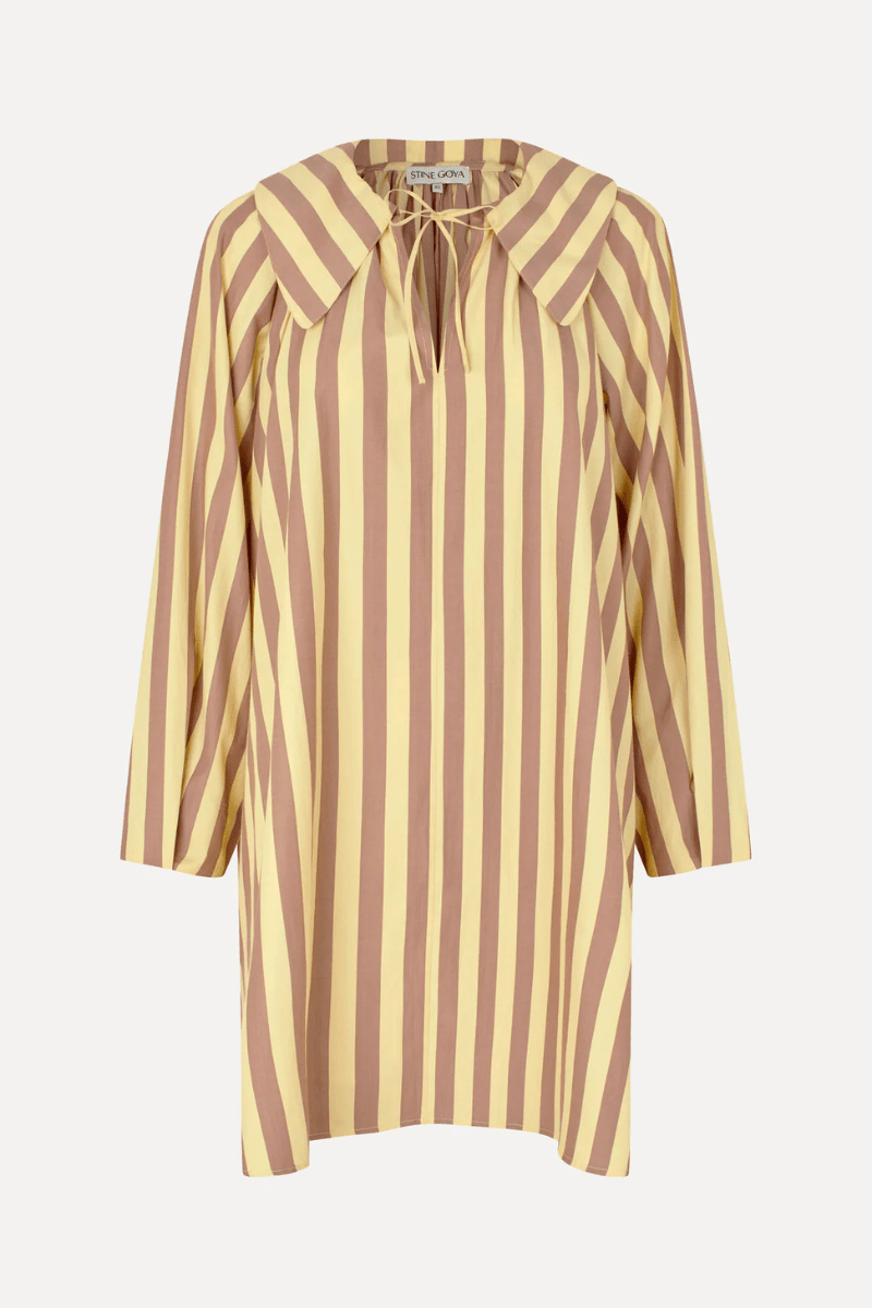 Short A-line dress in a crisp, lightweight fabric with yellow and brown vertical stripes. Designed with a statement collar, tie detail, and long sleeves.