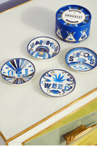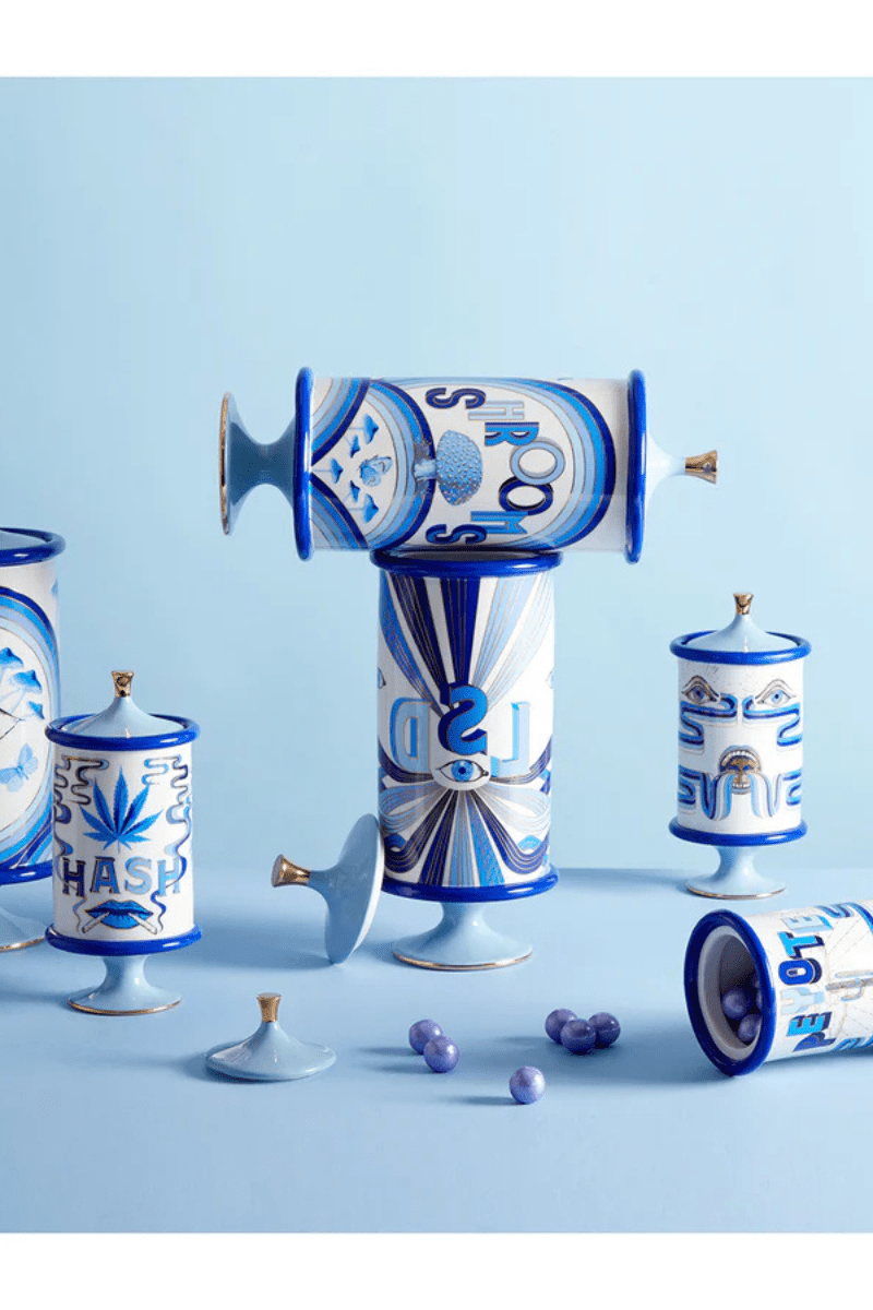 Expand your horizons with our Druggist Canisters. Dreamy third-eye mindscapes rendered in Delft-inspired blues and accented with real sparkly gold. High-fired porcelain elevates the experience. Stash your secrets in a single trippy vista, or cluster all four to create your own surreal apothecary.