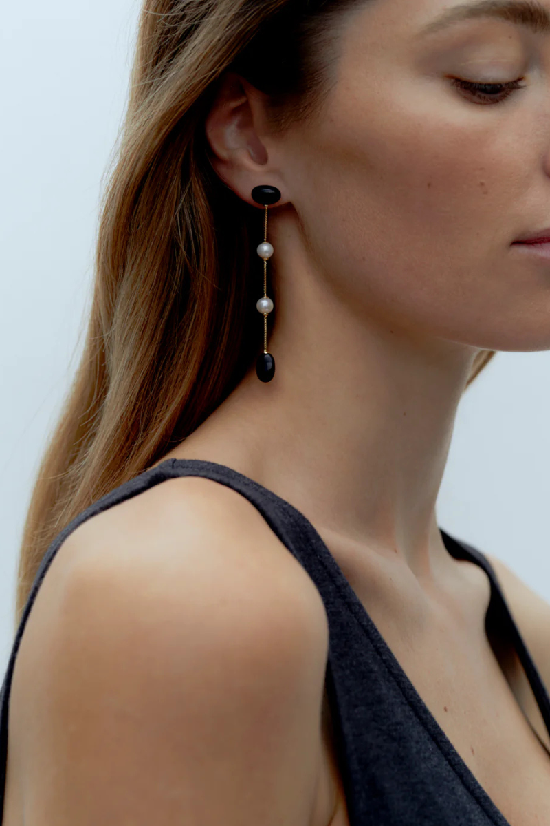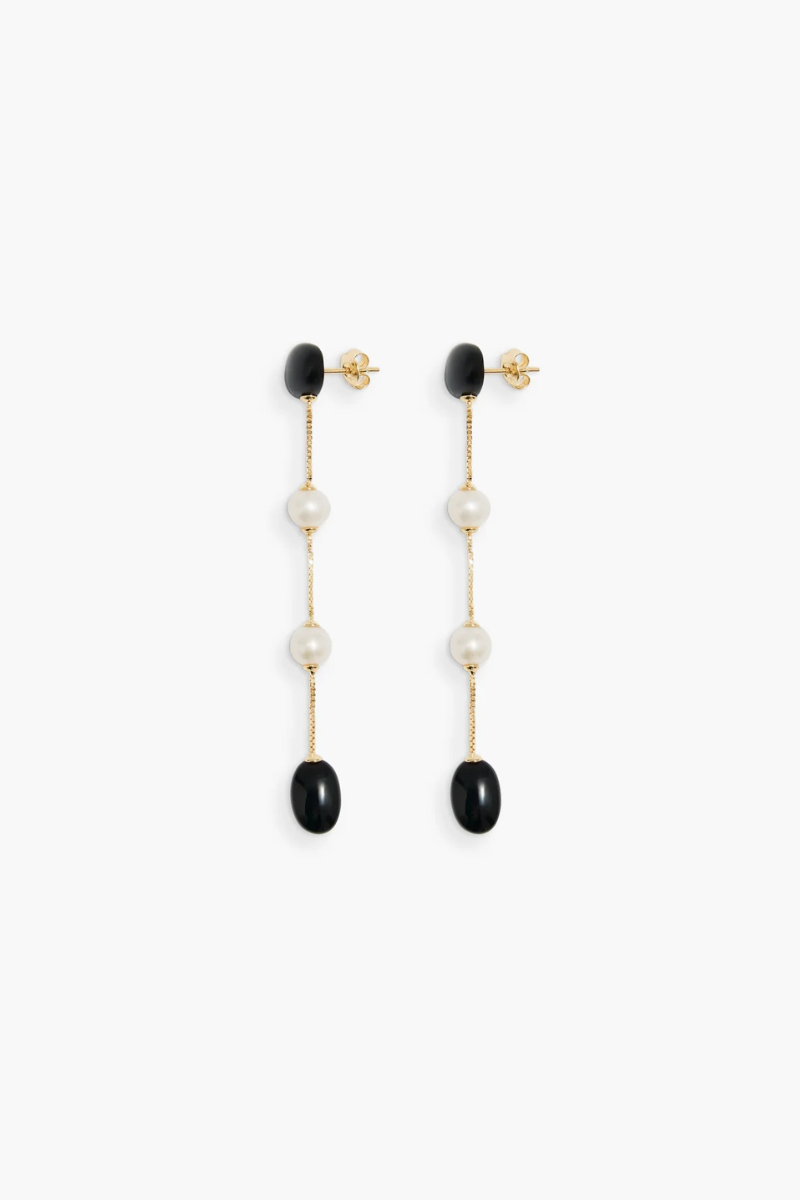 A pair of long sophisticated earrings crafted with creamy freshwater peals, black onyx, and 18k gold plating over 925 sterling silver trimmings. These earrings will draw attention from the moment you enter a room and make you stand out.