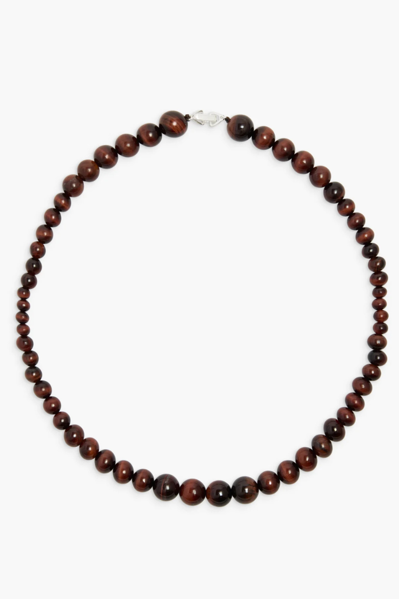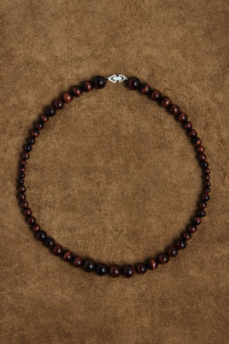 A modern necklace showcasing round red tiger eye stones in varying sizes, arranged in a distinctive pattern. Crafted in 925 sterling silver, this piece combines natural beauty with contemporary design for a striking look.