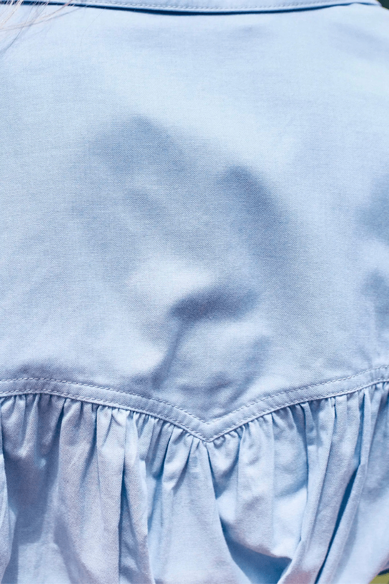 The Evangeline Shirt is an HB Basics essential that makes everyday dressing feel just a bit more special. Crafted in crisp blue oxford, this timeless staple is designed to pair effortlessly with all your favorite bottoms. It features an open collared neckline, pleat detailing along the sleeves, a back yoke seam, and delicate gathering at the back and shoulders, all subtle, thoughtful touches that elevate its classic feel.