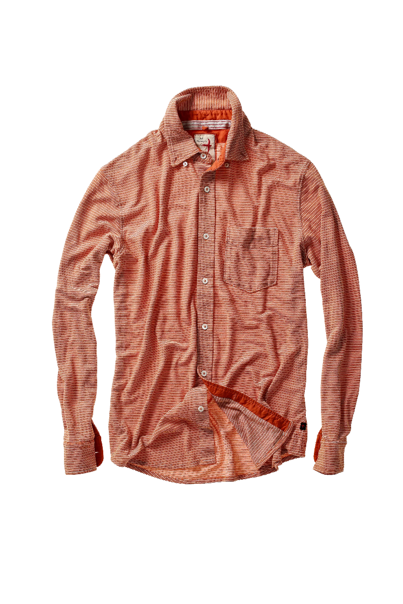 A new material for a familiar shape. Relwen's latest knitted shirt of finely spun hemp + cotton yarn is backed by woven cotton sheeting in key positions (collar, neckband, plackets, cuffs) to allow this knit to hold its shape. The fabric flexes and feels like a t-shirt yet looks completely proper when time for dress-up.