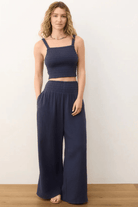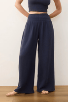 Here it is, folks. We've perfected the summertime beach pants. These pants feature our perfectly textured Double Cloth, so they're light and packable. Plus, they've got a high-rise, smocked waistband, full-length, wide leg, and work perfect with any ML tops.