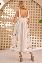 The Stefy Dress is a summer showstopper, combining artisanal detail with breezy elegance. Designed with tie straps, a flattering empire waist, and a full midi skirt, it's finished with vibrant multicolor embroidery, ladder lace trim, and blanket stitch edging for a handcrafted feel. Made from cotton canvas with a structured bodice and back zip closure, it's equal parts polished and playful—ready for everything from garden parties to getaways.