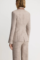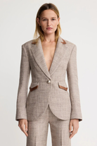 Moderately tailored, this spring tweed blazer features a horizontal waist seam, contrast leather taping and contoured back seaming detail. For a more tailored fit, consider sizing down.