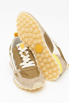 Features: Low-top style, silky recycled nylon base, leather and suede overlays, metallic accents, recycled speckled outsole and EVA midsole, lace-up closure.