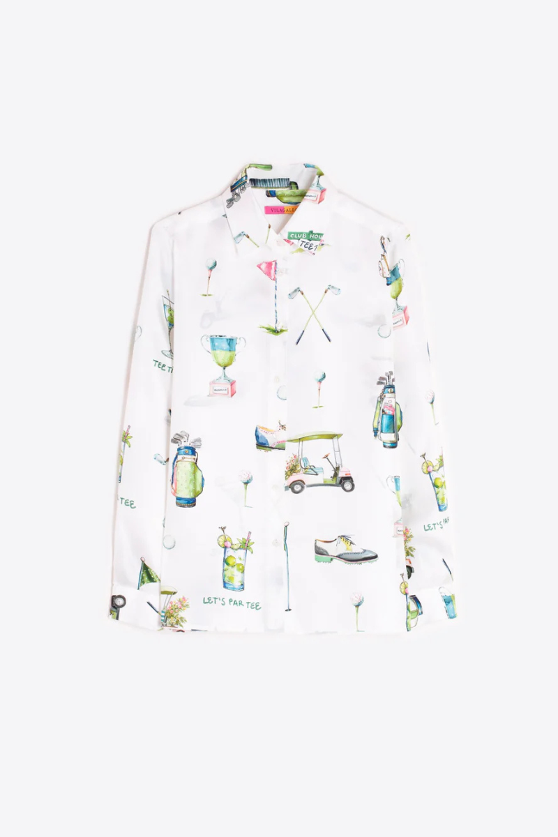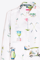 White shirt with golf-themed illustrations throughout. Features a classic shirt collar and visible button-front closure. Long sleeves with single cuffs and a straight hem. Straight cut.
